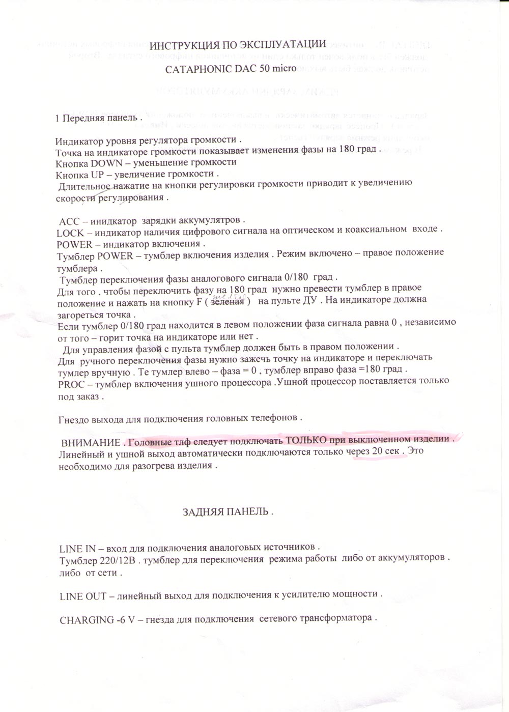 Постараюсь кусками надергать полезной информации из форума на Hi-Fi Простите, если что забуду или не замечу. В любом случае попробую привлеч к ветке самого автора устройства - тогда получим больше информации. Итак - дзо. Андрей Войтович _____________________________________________ По многочисленным просьбам -несколько дополнительной информации.Габариты 150-138-34.Джиттер-80 пС.Динамический диапазон- 117 дБ,С/Ш 119 дБ. Питание 12 В от акк или от сети. Преобразователь ток -напряжение на дискретах.Я так и не смог найти прилично звучащий оу. Процессор для ушей-отключаемый. ______________________________________________ Входы цифровые- оптич и коакс до 96 кГц(24 бит) пока. Нужно мнение народа по вопросу-делать ли на мультибитниках или оставить на сигме.Мультибитники могут заметно увеличить цену тк я пока не признаю других,кроме PCM 1704-PK.Можно и с дешевыми индексами ,но это не для меня. (комент от Майкрофта) - действительно - более дешевый вариант имеет право на скепсис в сою сторону. Он просто отличен, спору нет... но, как сказал один мой приятель -"Все дельта-сигмы одинаковы, вопрос обвязки". Так и тут - с дельта-сигмой вы получите великолепный звук. Но он будет так или иначе очень похож на другие девайсы с подобными цапами. К примеру Пегас и Катафоник на дельта-сигме можно считать братьями близнецами. Только один чуть повзрослее, другой чуть помладше. А вот на 1704 звук отличался уже не просто по уровню, а по характеру. И для многих это может оказаться принципиальной для выбора разницей. ______________________________________________ приемник DIR 1701 Вот несколько C A T A P H O N I C DAC 50 MICRO Цифро-аналоговый преобразователь CATAPHONIC DAC 50 MICRO предназначен для работы с любым цифровым источником ( CDP , DVDP , компьютером ) , имеющим выход цифрового сигнала типа SPDIF . Микроцап имеет : -2 цифровых входа SPDIF : оптический и коаксиальный. Формат цифровых входов – до 96 кГц- 24 бит. Коаксиальный цифровой вход имеет развязывающий трансформатор. -аналоговый , регулируемый линейный выход . Регулировка громкости осуществляется с помощью пассивной резистивной матрицы, которая коммутируется микрореле ( контакты –золото поверх серебра ). Шаг регулировки громкости -1 дБ , диапазон регулировки – 64 дб . Регулировка громкости осуществляется кнопками, расположенными на передней панели , или с помощью пульта ДУ. Имеется возможность резкого уменьшения громкости на 20 дБ с помощью пульта ДУ ( mute ) . -аналоговый выход для прослушивания на головные стереотелефоны. Усилитель для головных стереотелефонов работает в классе “ А “ и выполнен полностью на дискретных элементах . Выходное напряжение достаточно для работы с высокоомными стереотелефонами типа Zennheizer 580 600 650. Высокий выходной ток усилителя позволяет работать на низкоомную нагрузку до 8 Ом. Усилитель имеет защиту от КЗ в нагрузке. -регулируемый аналоговый вход для подключения аналоговых источников сигнала. . -переключатель фазы цапа “ 0 -180 “ ( только модель 50 ) . Тумблер переключателя фазы находится на передней панели. -аккумуляторное питание ( под заказ ) . В микроцапе используется 12 шт. аккумуляторов емкостью около 2500 мАч , либо емкостью 3800-4500 мАч. -сетевой выносной трансформатор для обеспечения режимов “ ЗАРЯДКА АКК. –РАБОТА “. -стереопроцессор , имитирующий звук на головные стереотелефоны , -как на АС . В результате этого отсутствует неприятный эффект локализации звука внутри головы слушателя. Поставляется под заказ. В 