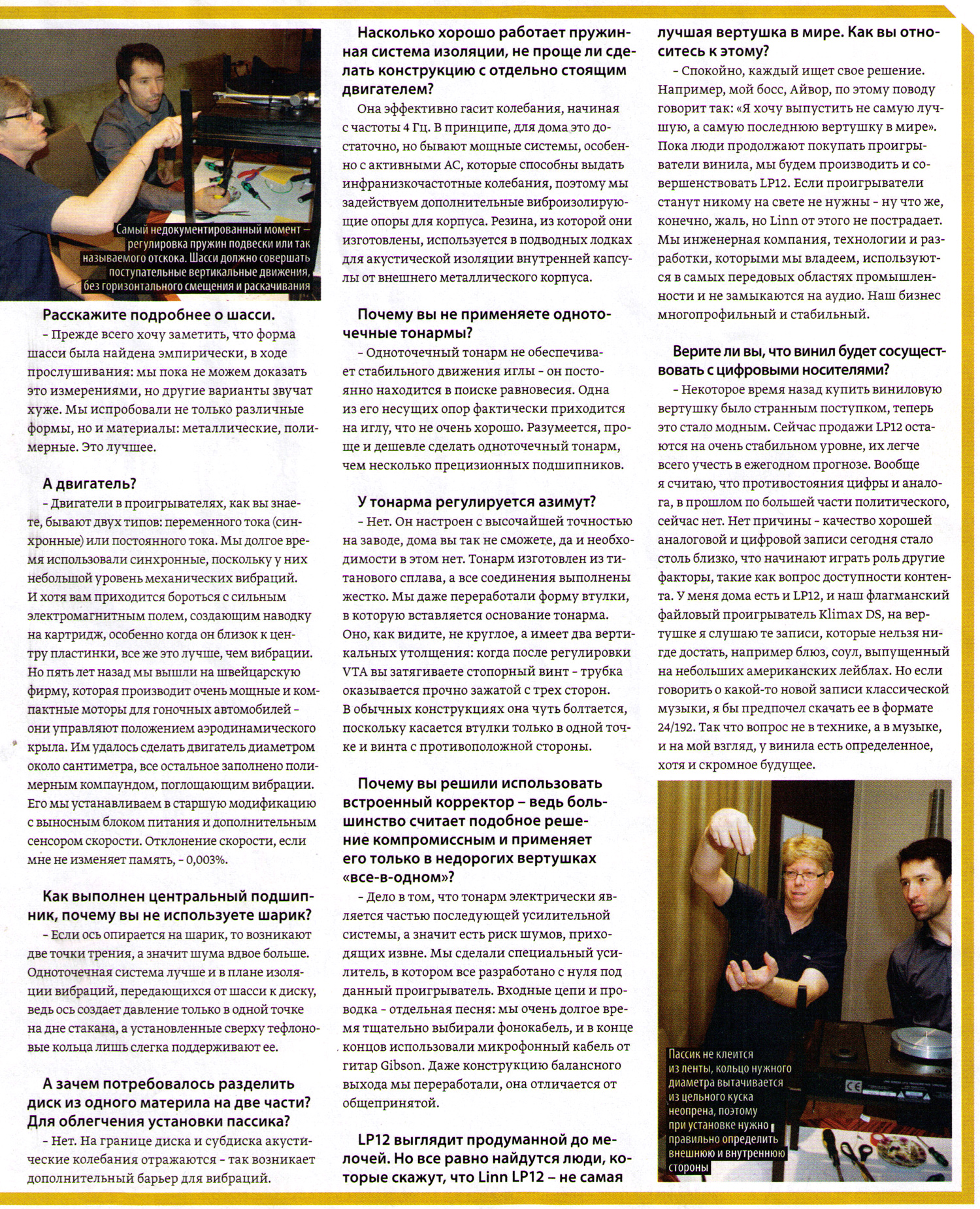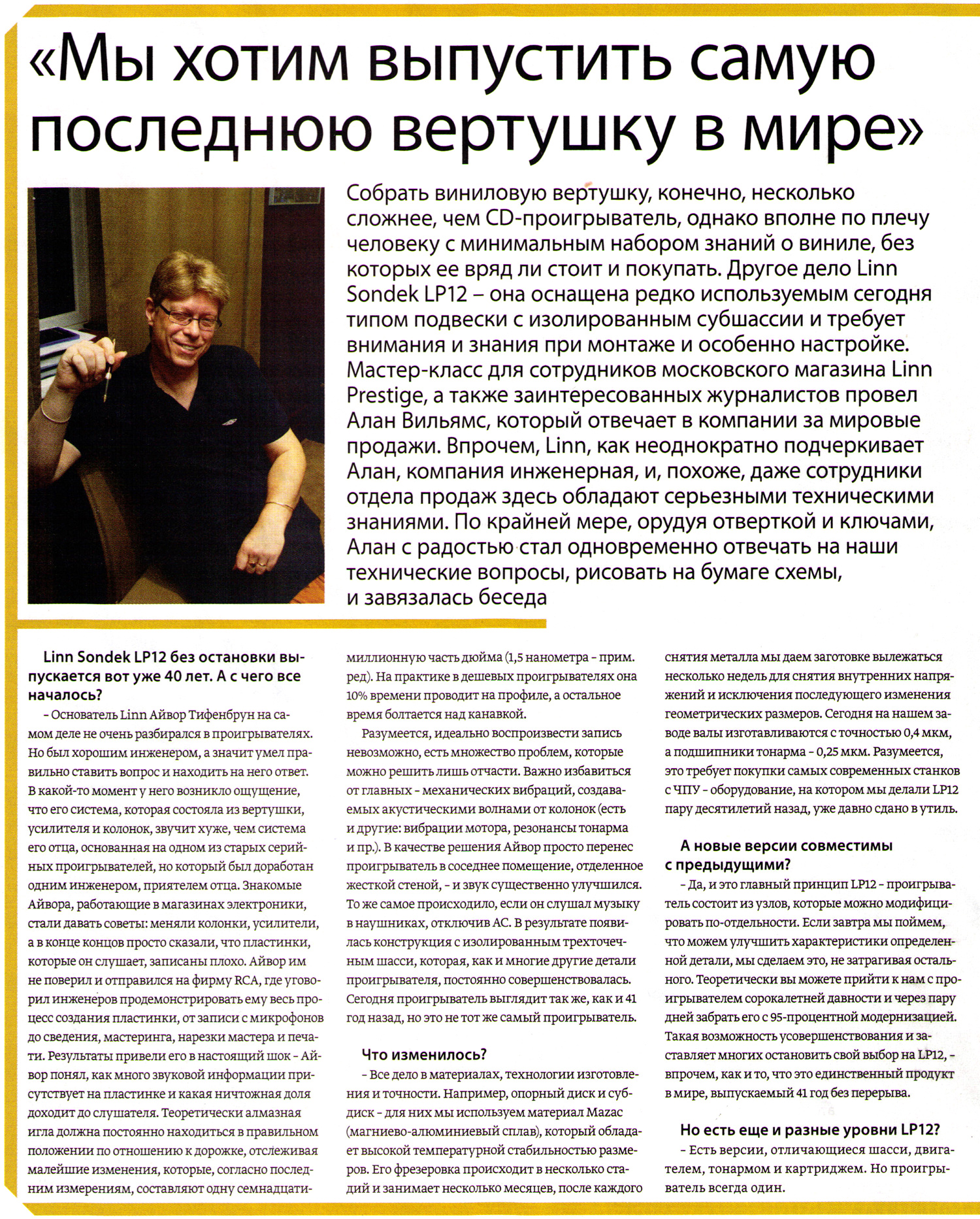 Оказывается по словам "Алана из Линна" игла винила способна по разрешающей способности соперничать с тунельным электронным микроскопом, на что указывает фраза о о отслеживании мельчайших изменений в 1.5 нанометра. Для тех кто не понял в чем тут прикол скажу - свет который мы видим имеет длинны волн порядка 380-700 нанометров. Тоесь с помощью лазерного луча красного цвета вы не способны обследовать те предметы которые оказывается можно исследовать с помощью иглы проигрывателя. Блеск. Фееречненько... Нах...й народ парится с рентгеновскими микроскопами (для волны как раз порядка единиц нанометров)... проехался иголкой по молекулярной структуре материала и радуйся себе... дешево и сердито. Второй момент порадовал тем что оказывается основатель был потрясен скока же на винили информации которую мы якобы не дополучаем. Ну может быть конечно... я например на вкус его его не пробовал и не способен поделиться мнением о том какой он вкусный. Но вот читая книгу мэра студио-строения Филипа Ньюэла я в общем прочел совершенно обратное. Например то, что даже ГРАМОТНЫЙ инженер готовящий релиз пластинки достаточно сильно "допиливает напильником" изначальный материал чтоб он лег под возможности винила вообще и дабы не повредить резцы, не вывести режим работы иглы за некие пределы не перекрыть канавки и т.д. и т.п. Кому мне интересно верить - человеку с техническим образованием собаку съевшего на работы "в-" и "со-" студиями или юристу самоучке пописывающему для журнальчиков. Кстати порадовал этот опус: "Форма Шасси найдена эмперически, в ходе прослушивания. Мы пока не можем доказать это измерениями, но другие варианты звучат хуже!" Вы меня извините... это пи...ц! -------------------- |