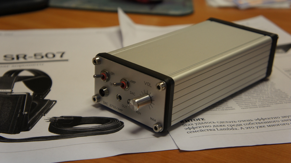 решил скопировать (без картинок): Обзор цифроаналогового преобразователя с USB-входом и усилителем MyST DAC 2702U AMP Комплект поставки ЦАП DAC 2702U AMP Сетевой шнур Кабель USB Когда возникает задача коммутации компьютера со стереосистемой и наушниками, нередко пользователи попросту перетыкают кабели, занимаются конструированием хитрых систем-переходников. И ладно бы, если всё это делалось для интегрированных звуковых карт, которым такие издевательства нипочём, иногда такое происходит и для вполне качественных дискретных моделей. Что может дать вам устройство, о котором пойдёт речь? Во-первых, оно не будет использовать интегрированную звуковую карту, не займёт слот PCI на материнской плате, поскольку подключение происходит по USB. У этого устройства есть выход на наушники с отдельным аналоговым регулятором громкости, а также линейный выход, то есть, помимо наушников, к нему можно подключить, например, стереосистему. В общем-то, вещь достаточно полезная (по своей сути), остаётся лишь финансовый вопрос. Рассматриваемый MyST DAC2702U AMP, основанный на микросхеме ЦАП PCM2702U, стоит без малого 14 тысяч рублей, это недёшево, и хотелось бы понимать, за что стоит заплатить такие деньги. Попробуем с этим разобраться. Начнём с комплекта поставки, он предельно аскетичен – само устройство, кабель USB и сетевой кабель. Разъёмы стандартные, можно легко купить второй комплект, скажем, для работы и носить ЦАП с собой. Внешний вид и удобство эксплуатации Нельзя сказать, что 2702U сделан дорого. Напротив – достаточно простой алюминиевый корпус, пластиковые окантовки на торцах, простые переключатели. Вот, для сравнения, Lehmann Audio Rhinelander (он стоит 15-16 тысяч рублей, но у него нет ЦАПа): Но по дизайну выбирать подобные агрегаты не очень-то правильно. С другой стороны, есть, к чему стремиться. Все элементы управления и разъёмы для коммутации расположены на передних и задних торцах. Спереди – переключатель включения/выключения питания и режимов ЦАП/усилитель, светодиод, сигнализирующий о том, что устройство работает, два выхода на наушники 3.5 мм, регулятор громкости. Сзади – линейный вход (коаксиальные разъёмы), линейный выход (разъём 3.5 мм), USB Type A для подключения к компьютеру и разъём-«восьмёрка» для подключения кабеля питания. Тут сразу сделаем остановку, есть вопросы. Зачем делать два разъёма для подключения наушников с разъёмом 3.5 мм, неясно. На мой взгляд, лучше бы смотрелась комбинация 3.5 и 6.3 мм. Чтобы подключить некоторые наушники (например, Ultrasone Edition 10), мне пришлось использовать переходник с 6.3 на 3.5 мм. То же – с линейным выходом, «тюльпаны» смотрелись бы гораздо более логично. Звук У меня достаточно долгое время был как тестовый образец DAC2702U, так и финальная версия, и я переслушал с этими агрегатами немало наушников. Разумеется, попутно проходило сравнение с моим любимым Hifiman HM-801 и игровой (или полупрофессиональной, если смотреть на железо) картой X-Fi Elite PRO. Тестовый образец, по чести говоря, не блистал – часты были перегрузки, на чувствительных наушниках было шипение усилителя, слышна была грязь. Финальный же образец изжил свои недостатки и звучал крайне неплохо. Наводок по питанию я не услышал, хотя у 2702U нет внешнего блока питания. Теперь давайте объясню, что вы получите (и для каких наушников), если захотите приобрести подобное устройство. Миниатюрные наушники-затычки: для дешёв